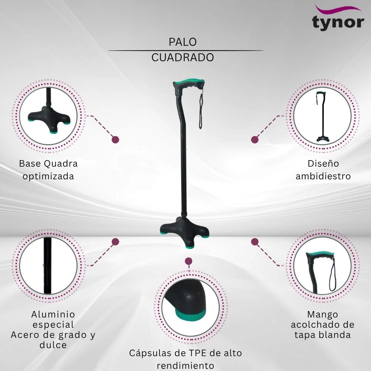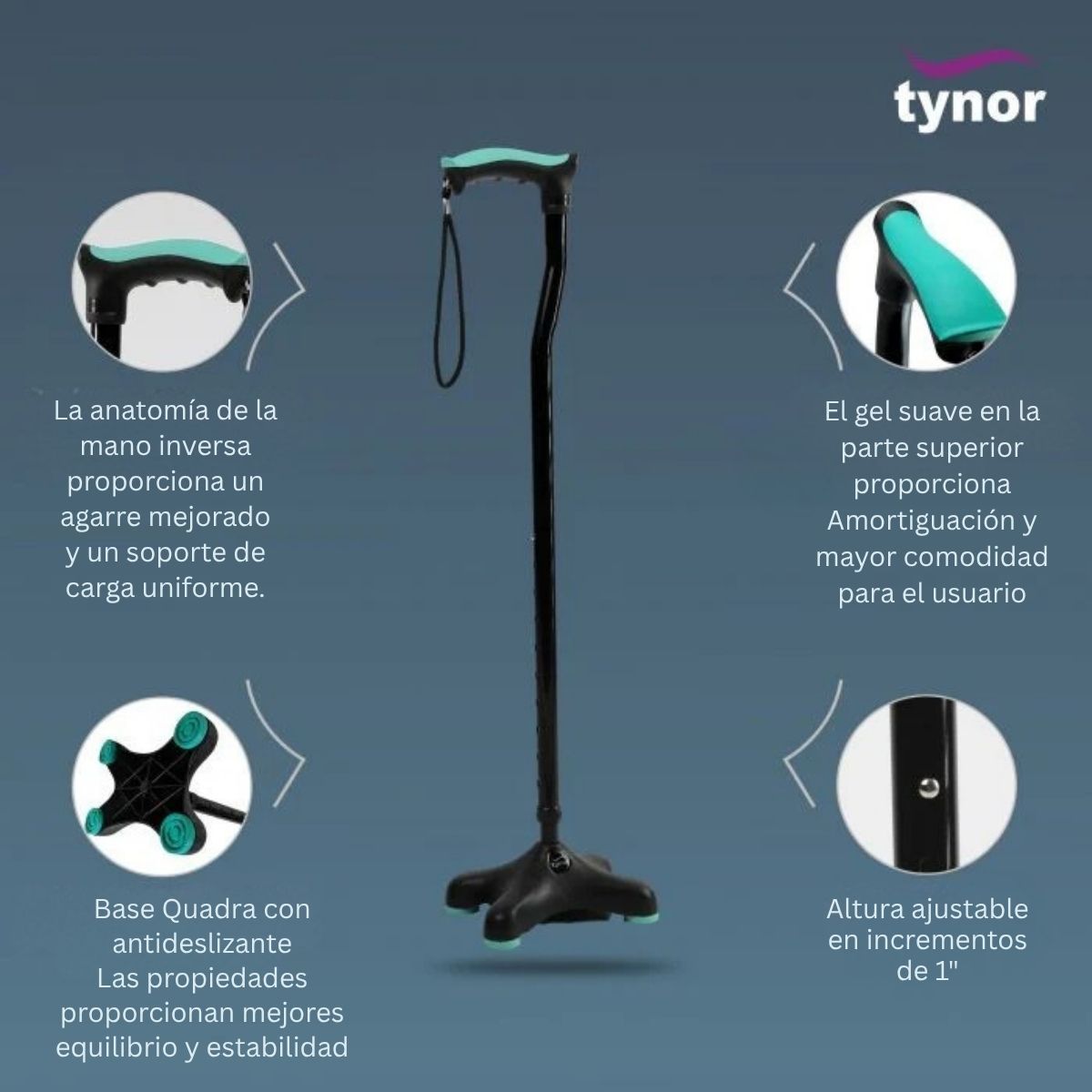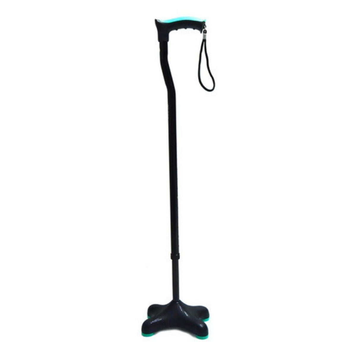 Bastón alemán de cuatro apoyos con base chica, es una ayuda para caminar, que puede ser utilizada por pacientes geriátricos o débiles. Puede usarse como ayuda de rehabilitación postoperatoria. La función de ajuste de altura asegura una carga adecuada, comodidad y una postura correcta.