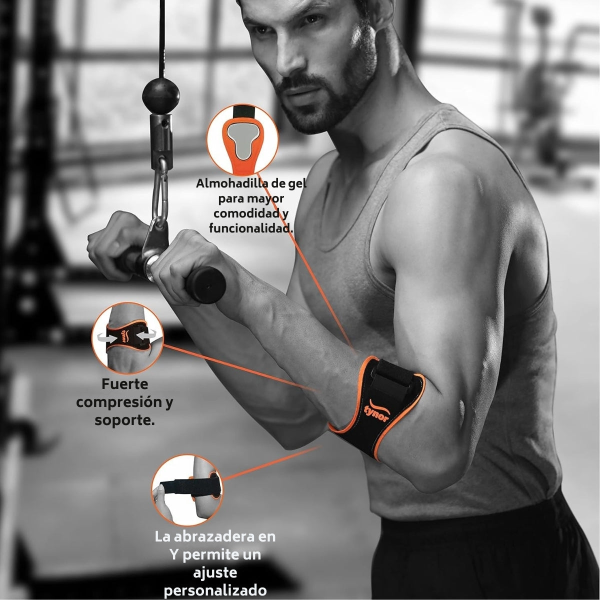 La Codera de Tenista Deportiva Pro, es una banda para el antebrazo que sujeta los músculos y tendones durante la actividad deportiva. Está especialmente diseñada para los deportistas que practican actividades con raqueta, levantamiento de peso o cualquier movimiento que implique un esfuerzo continuo o golpeo en el antebrazo. La almohadilla de gel está diseñada para ofrecer amortiguación, absorber el impacto de los golpes, distribuir la presión de los tendones y proporcionar comodidad.