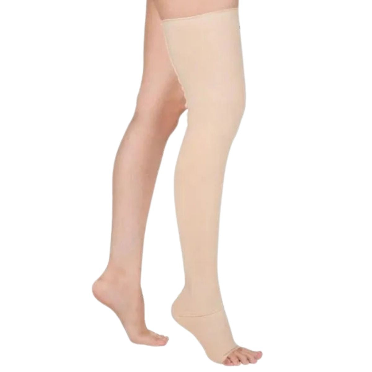 Media compresión al muslo, pie abierto, un par. Son prendas de ropa especializados, que proporcionan soporte y compresión graduada, en quemaduras, linfedema y otras afecciones vasculares
