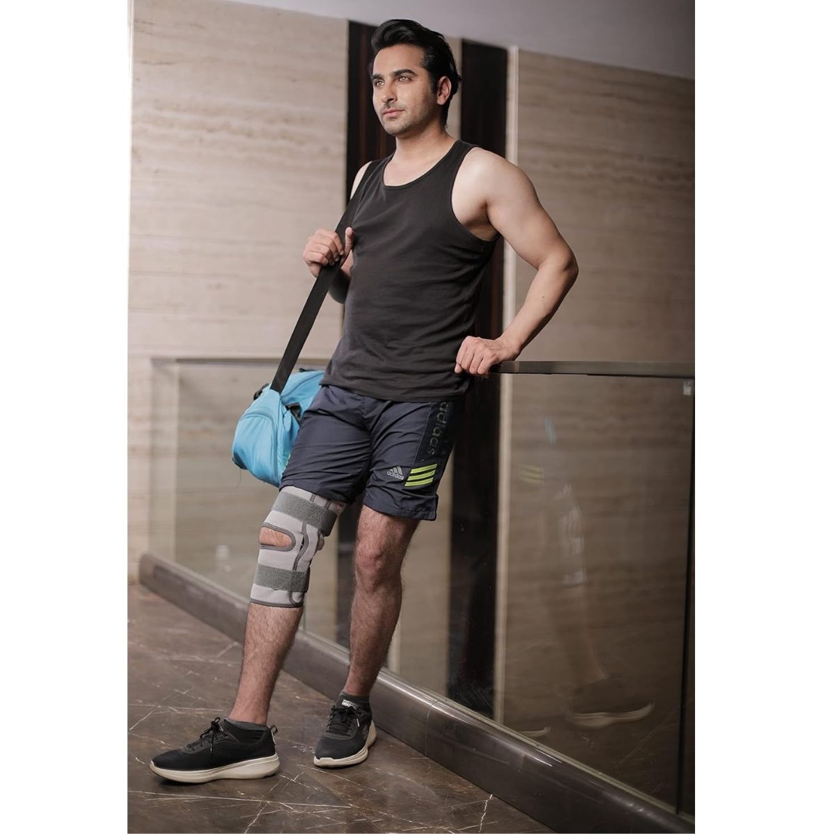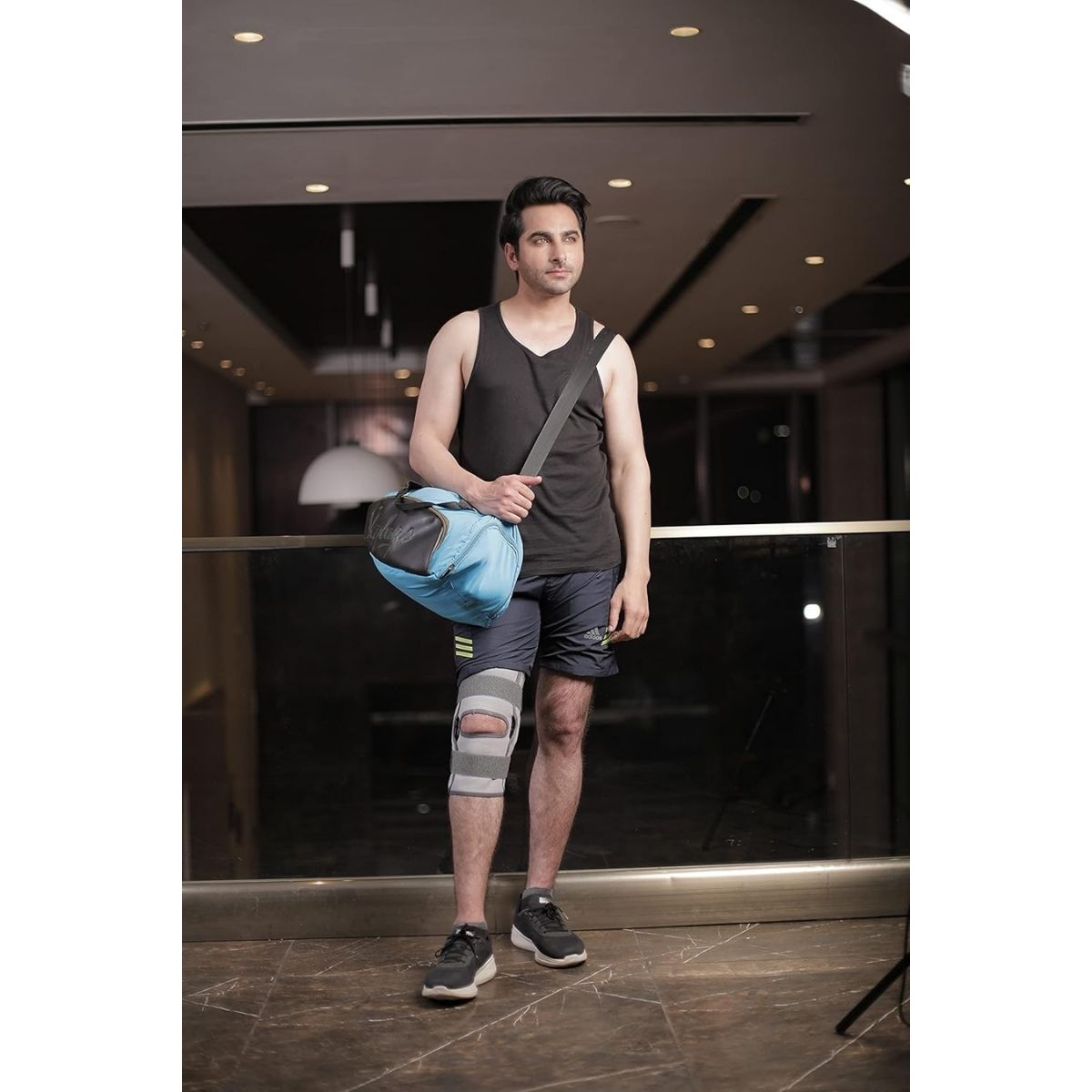 Rodillera mecánica abierta, de algodón elástico, es un dispositivo de apertura interior, el cual ofrece la ventaja de una compresión controlada alrededor de la rodilla y una inmovilización rígida lateral al mismo tiempo que el apoyo de una férula le permite la flexión normal y la libre circulación de la articulación de la rodilla